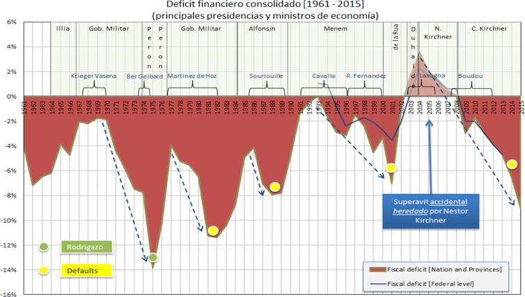 La fiscalité des exportations a permis de dégager les surplus budgétaires assez conséquents de l’ère Kirchner (voir le deuxième graphique). Ces excédents sont rapidement devenus la principale source de financement de plusieurs mesures populistes. Le gel des loyers, la réduction et le contrôle des tarifs de l’énergie, des carburants, ou encore des transports donnaient alors l’impression à la population que tout allait vraiment mieux qu’avant. Mais aucune réforme structurelle pour soutenir l’économie à long terme n’a été mise en place pendant cette période d’abondance. L’Argentine restait exclue des marchés internationaux, car les Kirchner refusaient de reprendre le paiement de la dette en bonne et due forme.