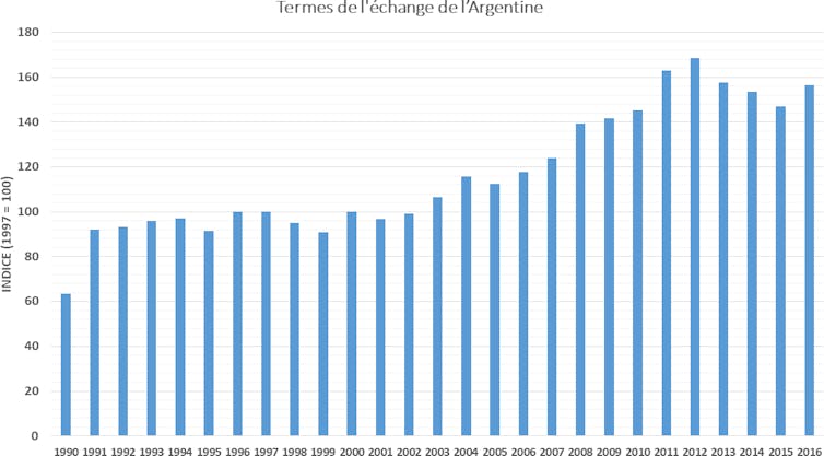 En 2003, Nestor et Cristina Kirchner prennent les rênes du pays. Dans les années 2000, l’embellie des prix des matières premières (abondantes en Argentine), bénéficiaient largement aux secteurs exportateurs. Les hausses dépassaient facilement les 100 % par rapport aux périodes précédentes. Le terme de l’échange (la mesure de valeur des exportations par rapport aux importations d’un pays) a bondi de 68 % entre 2000 et 2011. Autrement dit, non seulement l’Argentine exportait beaucoup, mais ses exportations valaient énormément par rapport à ce qu’elle importait.